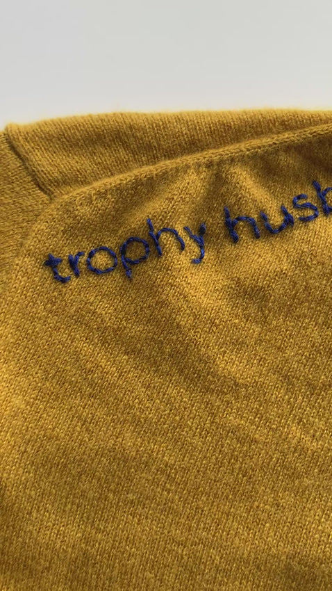 Write any phrase you'd like on the back left shoulder of this 100% cashmere men's sweater from Quince. It's a stunning sweater made even more beautiful with hand embroidery!
